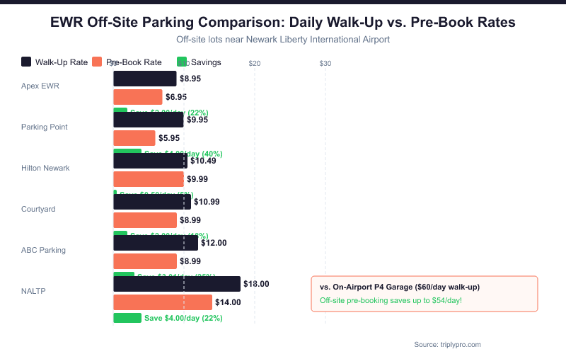 Off-site lots near EWR range from $8.95/day to $18/day, depending on the lot and whether you pre-book. On-airport garages run $60-$70/day at drive-up rates. The savings are real and significant.
