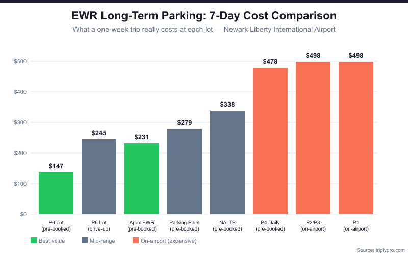 For a 7-day trip, that's $147 pre-booked vs $245 drive-up — a difference of nearly $100. Pre-booking through the official Newark Airport parking page locks in the lower rate and guarantees your spot.