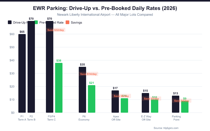 For a deeper look at every rate tier and how hourly charges stack up, see our full Newark Airport parking fees breakdown. The short version: off-site lots cost up to 87% less per day than the terminal garages, and pre-booking any lot locks in a lower rate.