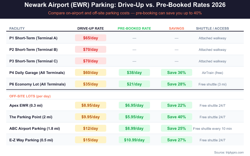 For a full breakdown of all terminal garage rates by the hour, see our Newark Airport Parking Fees: Full Rate Breakdown. The key takeaway: pre-booking consistently saves 28–36% on on-airport lots. Off-site lots can save even more — up to 70% compared to drive-up P2 or P3 rates.