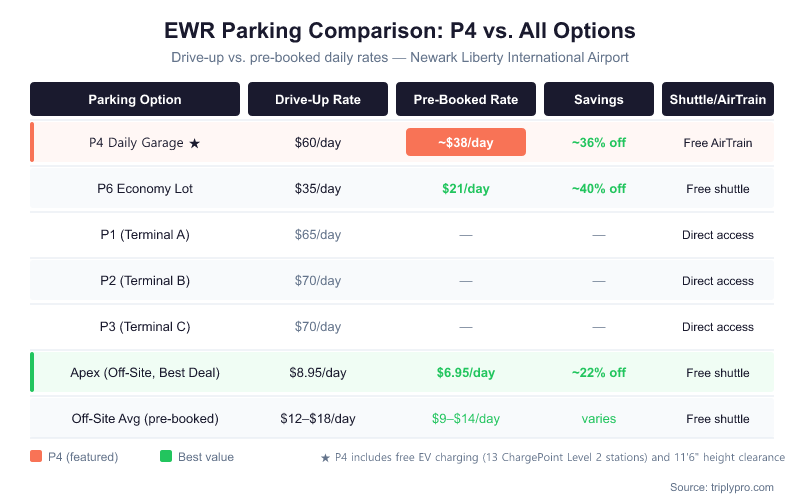 Ready to lock in your rate? Compare EWR P4 and off-site parking options from $8.95/day on Triply before spots fill up.