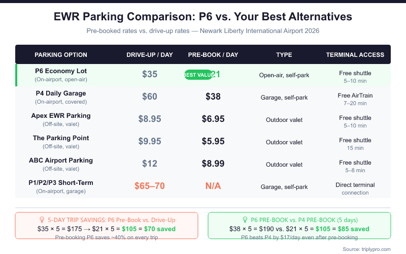 P6 is significantly cheaper than the terminal garages — but it's still more expensive than the best off-site lots. Apex EWR Airport Parking starts at just $8.95/day with a free 24/7 shuttle, undercutting P6's drive-up rate by more than $26/day. For a 5-day trip, that gap is over $100 in savings.