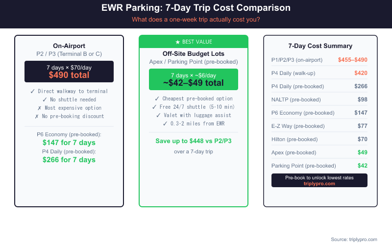 Yes — off-site parking near EWR is significantly cheaper than on-airport lots. The savings grow the longer your trip. Here is a cost comparison for a 7-day trip based on current verified rates:
