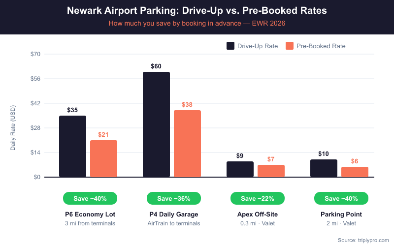 Quick math: A 7-day trip at P6 pre-booked ($21/day) costs $147. The same trip at Apex EWR ($8.95/day) costs $62.65. That's nearly $85 in savings — just by choosing an off-site lot with a free shuttle.