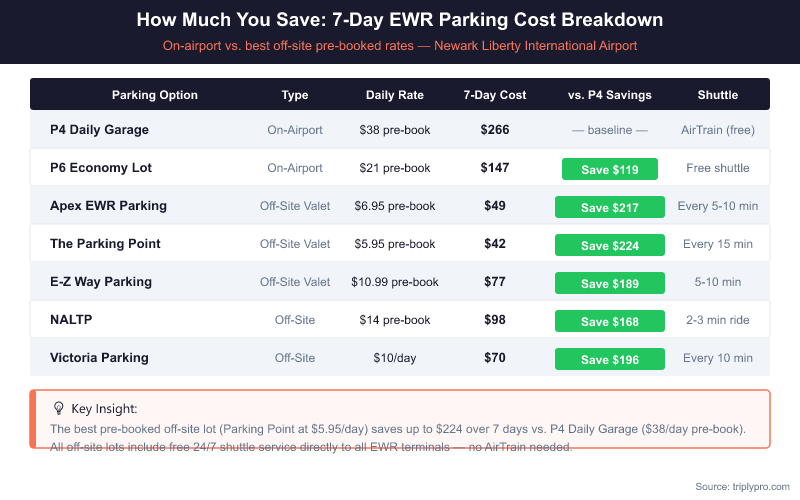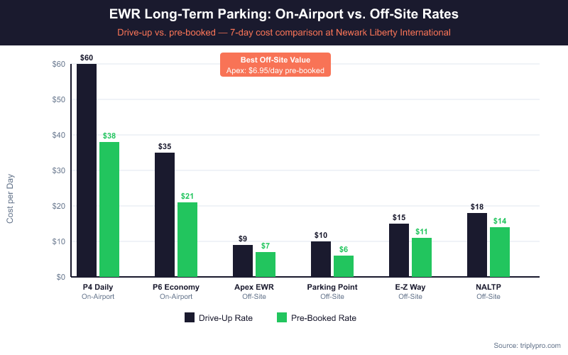 Off-site parking is often the smartest choice for multi-day EWR trips. Rates start at $8.95/day at Apex EWR Airport Parking — less than half the pre-booked P6 rate. Every verified off-site lot includes a free 24/7 shuttle to all terminals.