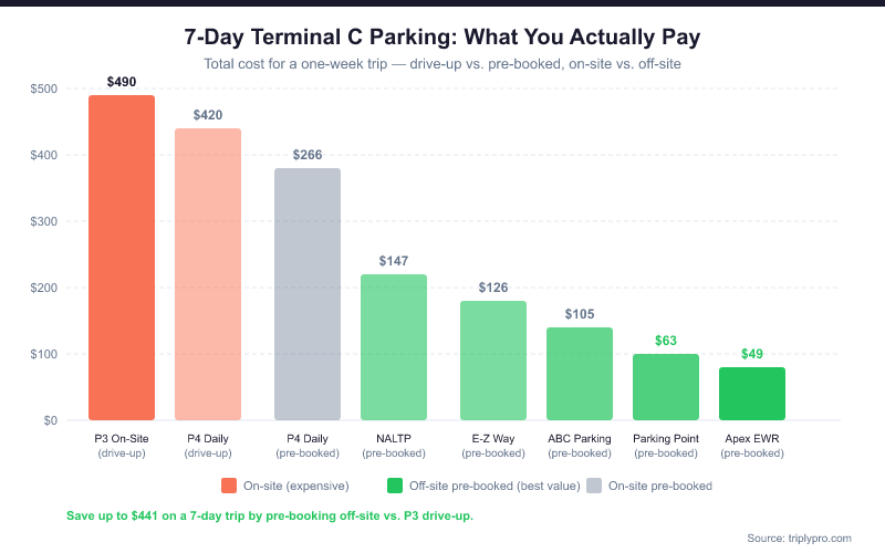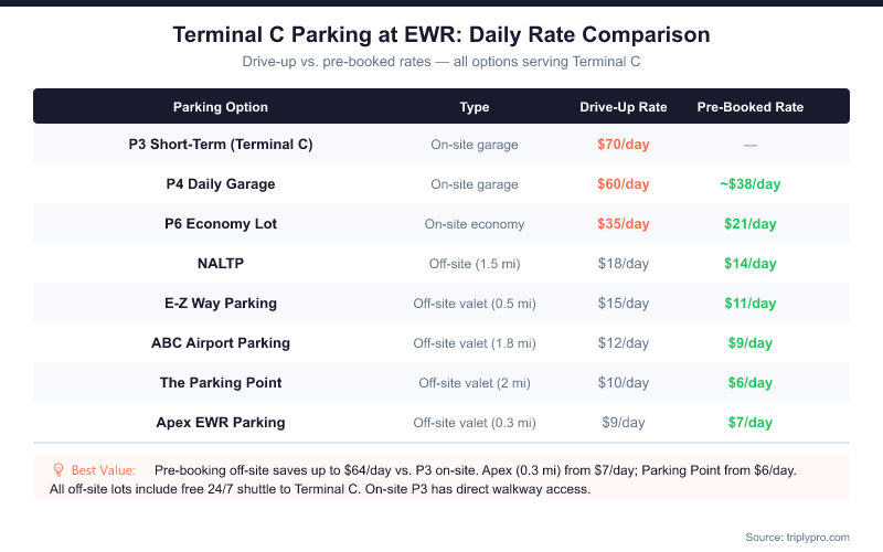 Terminal C parking at EWR ranges from $21/day (P6 pre-booked) to $70/day (P3 drive-up), with off-site alternatives starting at $8.95/day. The right choice depends on how long you're staying and how much convenience matters to you.