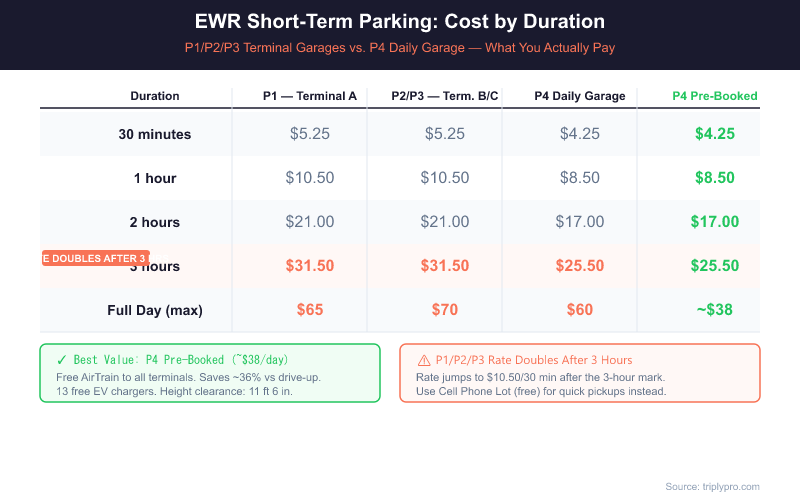 Short-term parking at Newark Liberty runs from $5.25 per 30 minutes in terminal garages to a pre-booked $21/day at P6 — with off-site lots cutting costs even further for stays over a few hours. Pre-booking P4 saves roughly 36%. Using the free Cell Phone Lot saves 100% on pickups. The right choice depends on how long you're staying, which terminal you need, and whether covered parking matters to you.