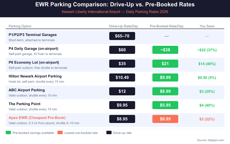 - Compare rates first. Use Triply's EWR parking search to see live rates across on-airport and off-site options side by side.