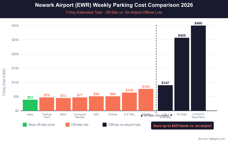 - Off-site weekly parking runs $8.95–$18/day across 8 verified lots near EWR — far cheaper than on-airport options.