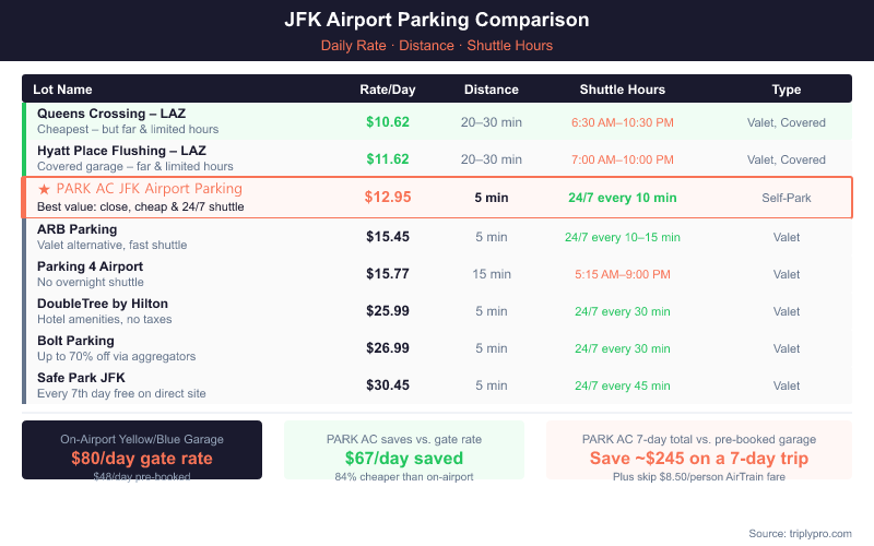 PARK AC JFK is the third-cheapest verified lot near JFK, based on current Triply listings (as of 2026). It is the cheapest lot that is both close to the airport and operates a full 24/7 shuttle.