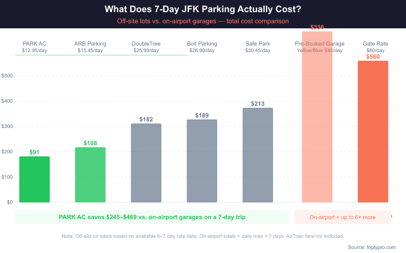 At $12.95/day, PARK AC is nearly 4x cheaper than the pre-booked on-airport rate. On a 7-day trip, that saves you roughly $245 vs. the Yellow or Blue Garage — before any coupon. Travelers using off-site lots also skip the $8.50 AirTrain fare per person that Economy Lot 9 users pay to reach their terminal, adding further savings.