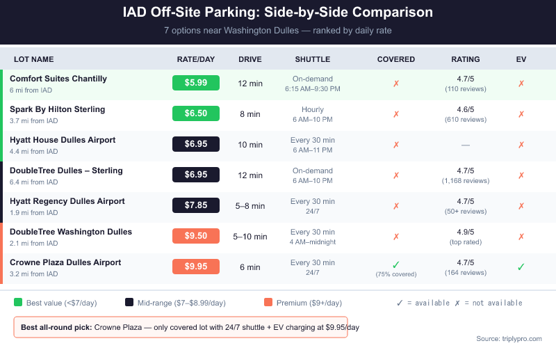 The Hyatt Regency Dulles stands out for early or late flights — its shuttle runs 24/7 (on-demand outside 6 AM–11 PM). The Crowne Plaza is the only off-site lot with partial covered parking, plus EV charging. If you want the lowest rate available, Hyatt Regency can drop to $5.75/day via onestopparking.com (verified April 2026).