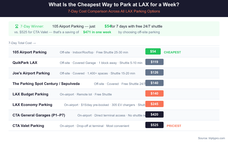 - QuikPark LAX: ~$119 (7 × $16.95)