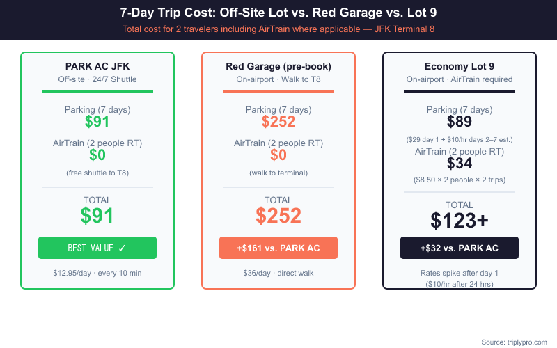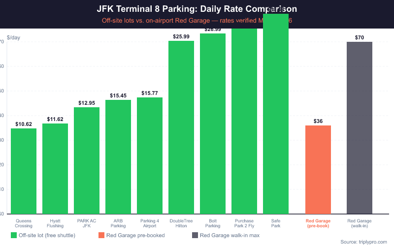 The cheapest off-site lot — Queens Crossing at $10.62/day — costs about 70% less than the Red Garage's pre-booked rate of $36/day. Over a 7-day trip, that gap adds up to more than $175. However, Queens Crossing has no overnight shuttle, which is a problem for red-eye flights.