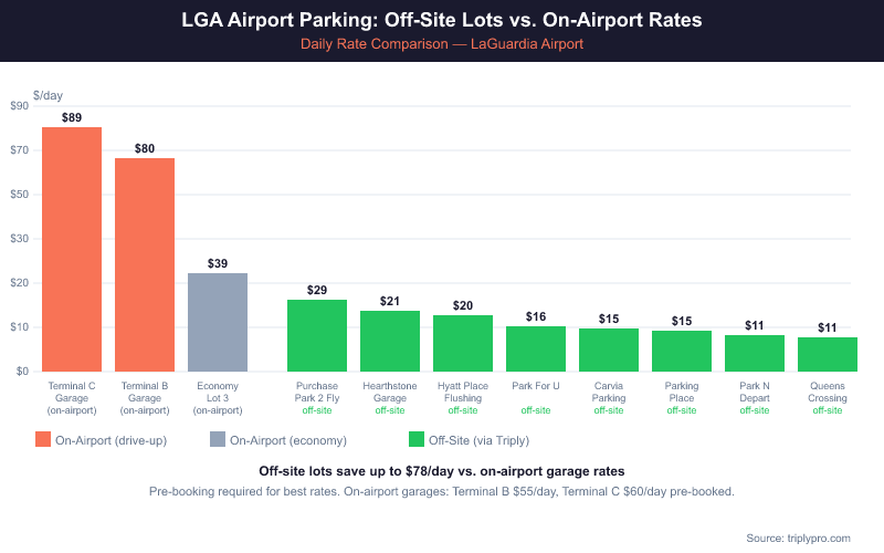 On-airport parking at LaGuardia runs $39–$89/day depending on which lot you choose. Off-site lots start at $10.95/day — a savings of over 85% compared to the Terminal C Garage walk-up rate. Check LaGuardia's official parking page for the latest on-airport rates.