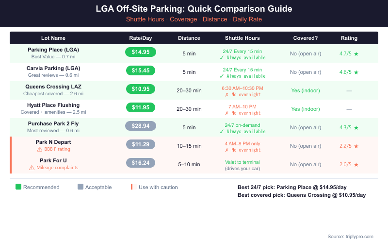 Parking Place ($14.95/day) and Carvia Parking ($15.45/day) both run 24/7 shuttles every 15 minutes. They're just 5 minutes from LGA. If your flight lands at 1 AM or departs at 5 AM, these two lots are your safest bets.