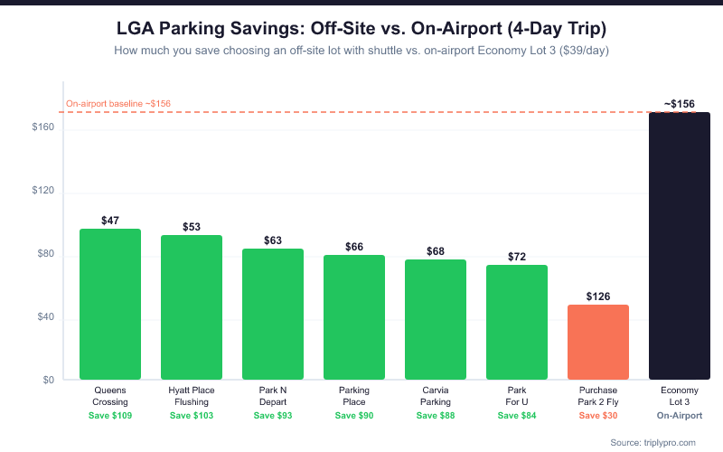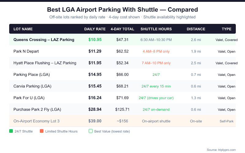 We compared 9 verified off-site lots near LaGuardia. Here's the full picture based on shuttle availability, distance, and daily rate (verified April 2026):
