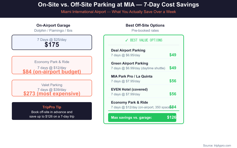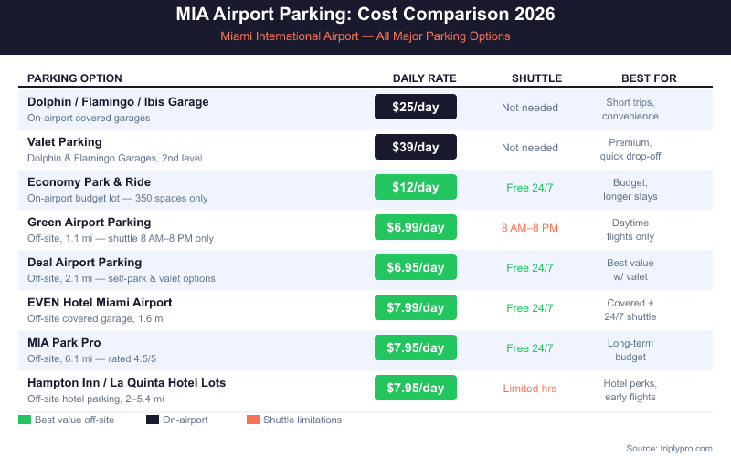 Before we break down every option, here's a quick way to save time: compare all parking near Miami Airport (MIA) on Triply — off-site lots from $6.99/day with free shuttle included.