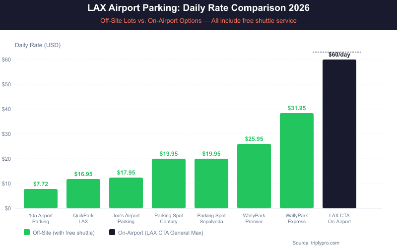LAX parking rates vary widely depending on where you park. On-airport terminal garages are the most expensive option. Off-site lots near LAX are significantly cheaper and always include free shuttle service.