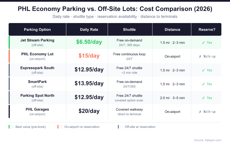 | PHL Economy Lot (on-airport) | $15/day | Free continuous loop, 24/7 | On-airport | No — walk up only |