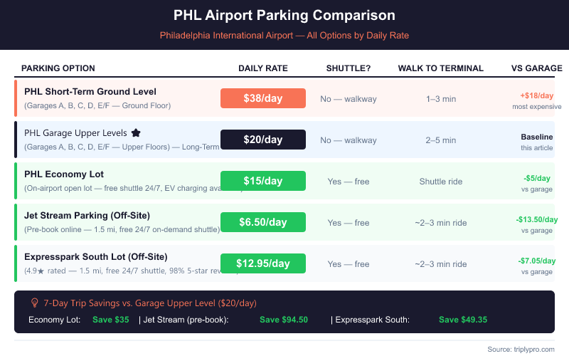 The upper level garage rate at Philadelphia Airport is $20 per day maximum (verified April 2026, per the Philadelphia Parking Authority). This is the same across all five garages — A, B, C, D, and E/F. Below is a full side-by-side comparison of every parking option at and near PHL.