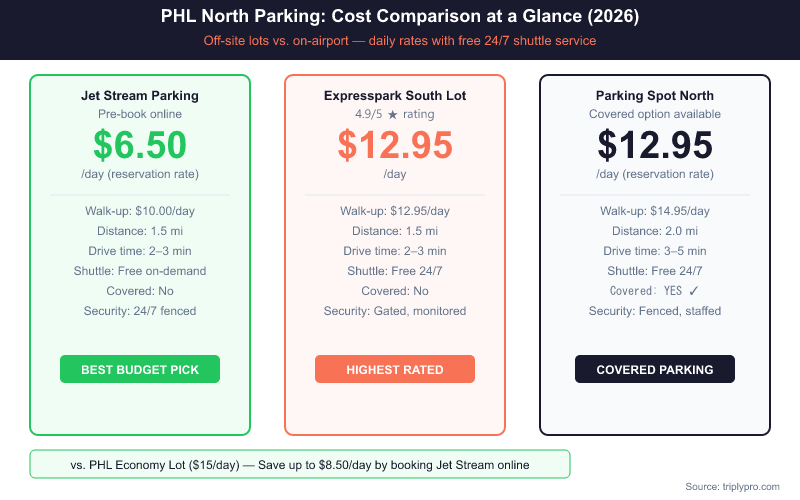 TL;DR: North-area PHL parking runs $10–$14.95/day, all with free 24/7 shuttles — significantly cheaper than on-airport garages.