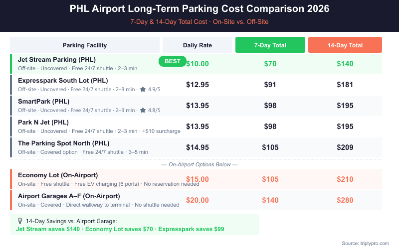 The cheapest long-term parking at PHL is Jet Stream Parking at $10/day. That's 50% less than on-airport garage parking and 33% less than the Economy Lot. All six off-site lots beat or match the Economy Lot on price — and every single one includes a free shuttle.