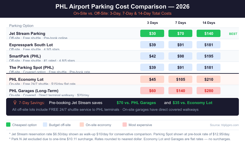 - Jet Stream Parking (PHL): $10/day — cheapest available option. Uncovered, self-park. Free on-demand shuttle runs 24 hours a day, 365 days a year. Fenced lot with 24/7 security. Free cancellation.