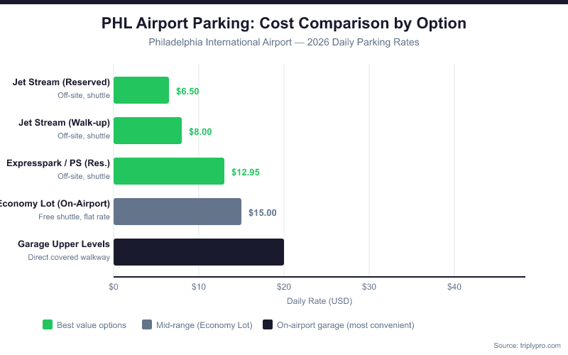- Economy Lot: PHL's on-airport economy lot charges $15/day flat (all taxes included). A free 24/7 shuttle runs continuously to all terminals. This is your first backup.