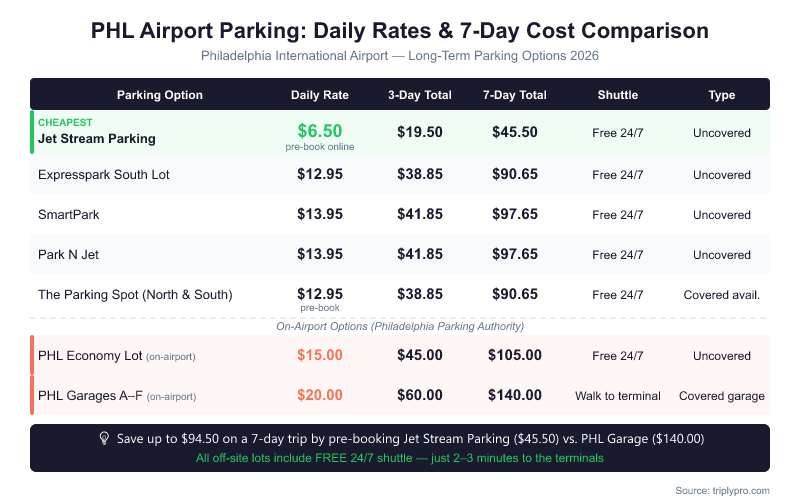 Ready to lock in your PHL long-term parking rate? Compare all Philadelphia International Airport lots — from $10/day at Jet Stream to the on-airport Economy Lot at $15/day — and book with free cancellation at Triply's PHL parking search.