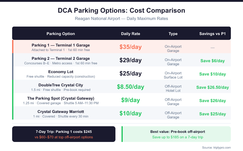 A 5-day trip in Parking 1 costs $175 at the $35/day max. The same trip at the Economy Lot costs $125 — and as little as $42.50 at the Sheraton Suites Old Town Alexandria off-site lot. For longer stays, that gap grows fast. See our full Reagan Airport parking cost breakdown for rate comparisons across all options.