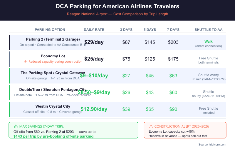 American Airlines passengers at DCA should use Parking 2 (Terminal 2 Garage) at $29/day or off-site hotel lots from $8.50/day. Full rates, shuttle times, and construction tips inside.