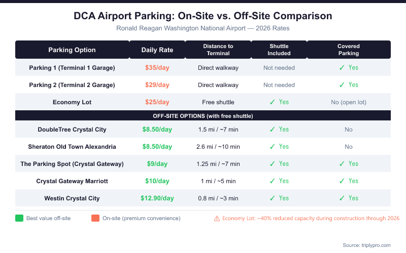 - Off-site alternatives: Nine verified hotel lots from $8.50–$15/day, all with free shuttles to DCA terminals.
