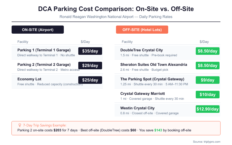 Reagan airport parking daily rates range from $25/day at the on-airport Economy Lot to $35/day at Parking 1, while off-site hotel lots near Ronald Reagan Washington National Airport (DCA) start as low as $8.50/day. The right choice depends on your trip length, your terminal, and how much time you're willing to trade for savings. For a 7-day trip, choosing an off-site lot over Parking 1 can save you over $180 — a significant difference.