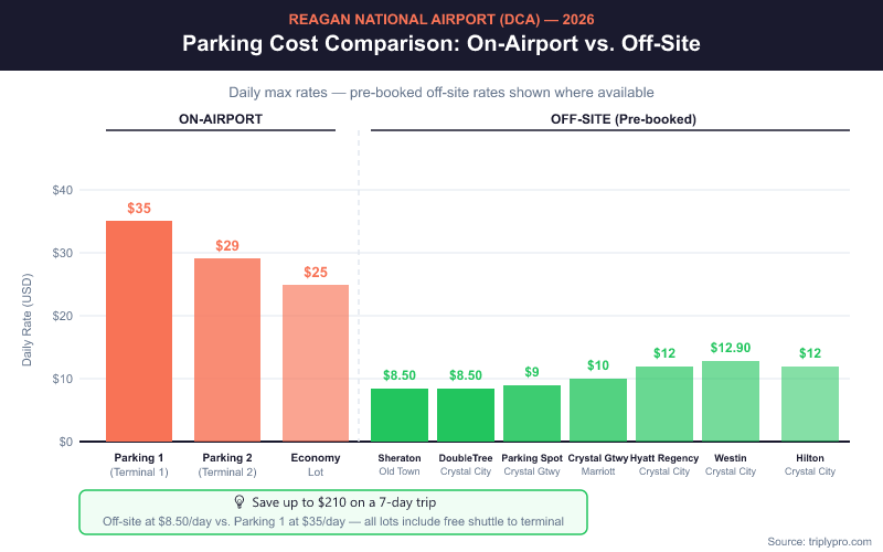 Off-airport parking is almost always cheaper than DCA's on-site garages. The gap is significant: $8.50–$15/day off-site versus $25–$35/day on-site. Here's a direct comparison of verified options (April 2026):