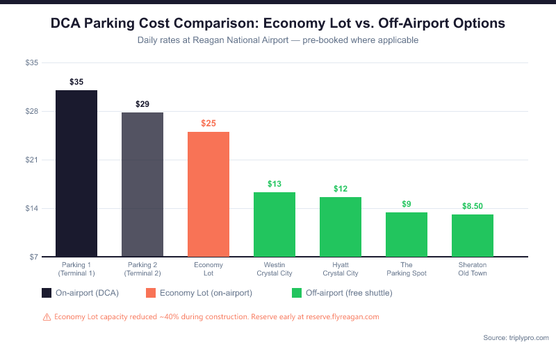 | DCA Economy Lot (on-airport) | $25.00 | Free (24/7) | On-site |