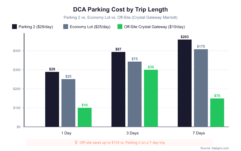 For a 7-day trip, off-site lots like the Crystal Gateway Marriott at $10/day save you $133 compared to Parking 2 — that's more than 65% off. Even the Economy Lot saves you $28 per week. For a deep look at all on-airport rate comparisons, see our Reagan Airport Parking Cost guide.