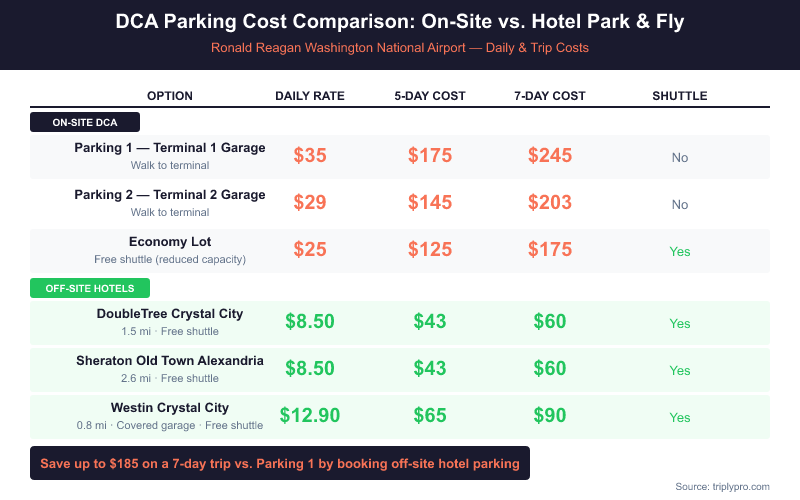 Hotel parking near DCA is significantly cheaper than on-airport options for any trip longer than one day. Here's a direct cost comparison based on current rates (verified April 2026):
