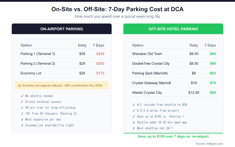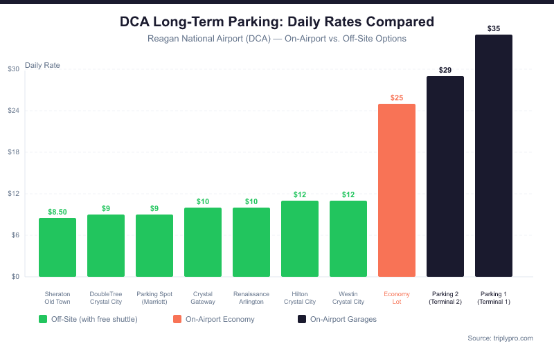 Long-term parking at DCA ranges from $25/day on-airport to as low as $8.50/day at off-site hotel lots in Crystal City and Pentagon City. The gap grows fast on multi-day trips — a 7-day stay in Parking 1 costs $245, while the same week at the Sheraton Suites Old Town Alexandria runs just $59.50.