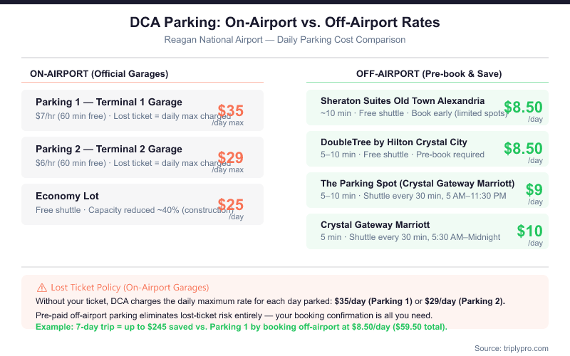 For context on standard DCA parking rates and how they compare across lot types, see our full Reagan Airport parking cost guide.