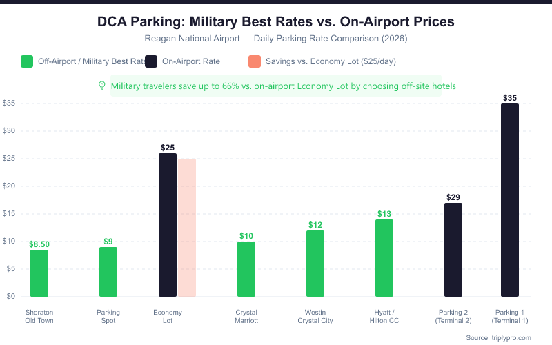| DCA Economy Lot (on-airport) | $25/day | No military discount | Baseline |