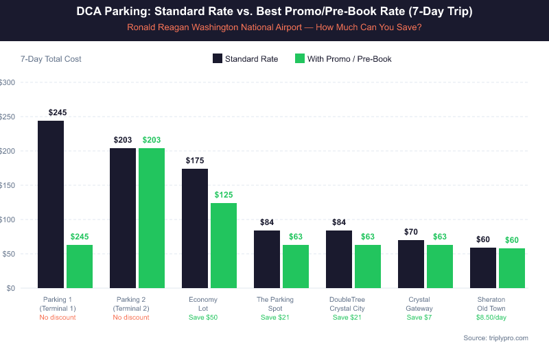 DCA on-airport parking is the most convenient option but also the most expensive. Off-site lots with promo codes can cut your total parking bill significantly — especially on trips longer than 3 days.