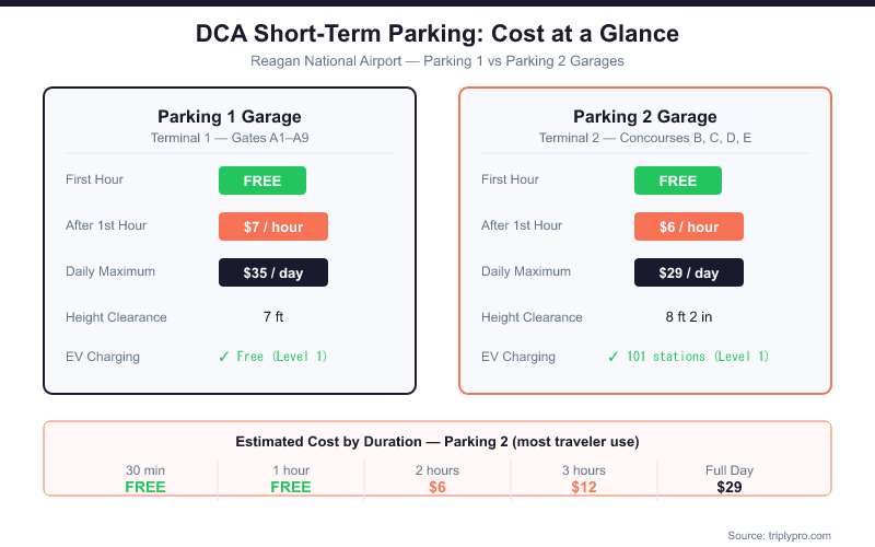 Reagan airport parking short term is on-airport garage parking at Ronald Reagan Washington National Airport (DCA) designed for stays under 24 hours — pickups, drop-offs, and quick visits. The two garages, Parking 1 and Parking 2, both offer the first 60 minutes free. After that, Parking 1 charges $7/hour (max $35/day) and Parking 2 charges $6/hour (max $29/day). Both garages are directly connected to the terminals, making them the fastest option for short stays at DCA.