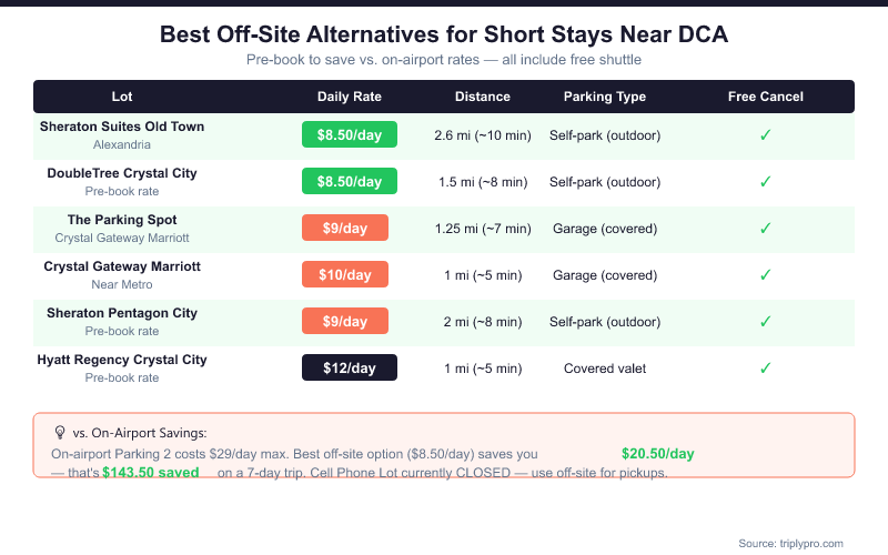 For a stay under 3 hours, the on-airport garages are cheaper than the off-site daily rates. But once you cross 4–5 hours, the Sheraton Suites Old Town Alexandria at $8.50/day or The Parking Spot at $9/day undercut Parking 2's $29 daily max by up to 71% (based on current Triply rates). For a full comparison of off-site options near DCA, see our guide to cheap DCA airport parking rates near Reagan National.