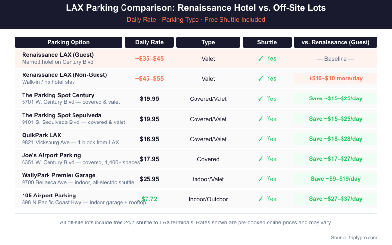Here's how Renaissance LAX parking costs compare to other options nearby (verified April 2026):