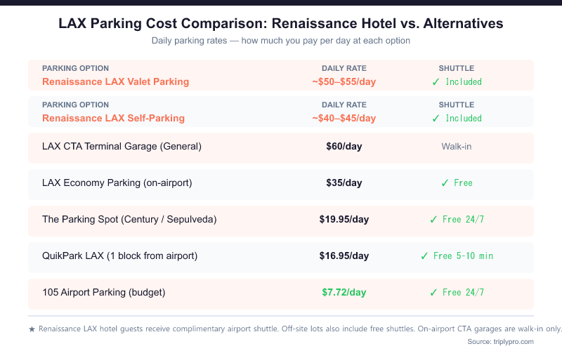 | Renaissance LAX Self-Parking (hotel guest) | ~$40–$45/day | Verify directly with hotel |