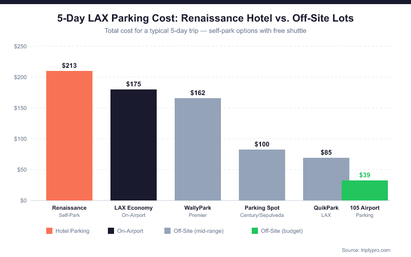 Choosing 105 Airport Parking over Renaissance LAX for a 7-day trip saves you roughly $225–$260. Even a mid-range off-site lot like The Parking Spot Century saves you over $140 for the same trip. All of these off-site lots include a free 24/7 shuttle to all LAX terminals.