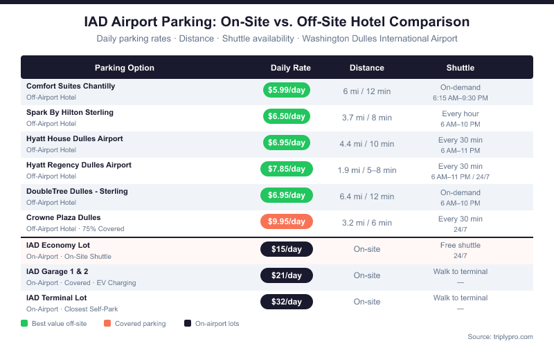Rates verified April 2026. On-airport rates per Washington Dulles International Airport official parking information. Off-site hotel rates based on current Triply data.
