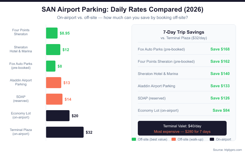 The fastest way to cut your SAN parking bill is to book off-site and pre-pay online. Here's a practical savings playbook based on current verified rates.