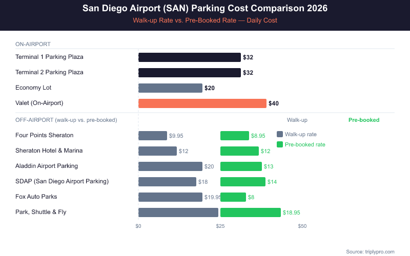 San Diego airport parking cost per day is the daily fee charged to leave your car at San Diego International Airport (SAN) — either in an on-airport structure or an off-site lot nearby. Rates at SAN range from $9.95/day at the cheapest pre-booked off-site lot to $40/day for on-airport valet service, as of 2026. Knowing every option before you drive in can save you hundreds of dollars on a week-long trip.